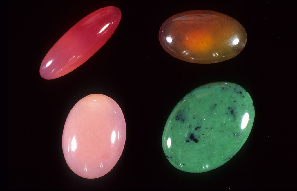 Four polished "Transvaal jade" cabochons. The one on the bottom right is 3 X 2.2 cm.
